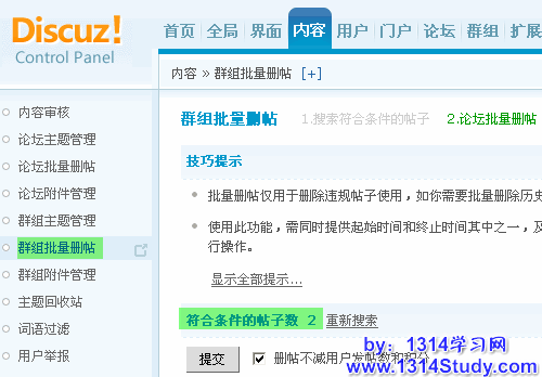 1、群组批量删帖仅用于删除违规帖子使用,如您需要批量删除历史旧帖,请使用群组批量主题管理功能。