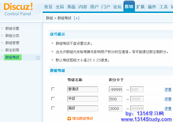 群组等级不宜设置过多,默认有三个群组等级,分别为普通级、中级和高级。可以根据站点实际运营情况增加群组等级。