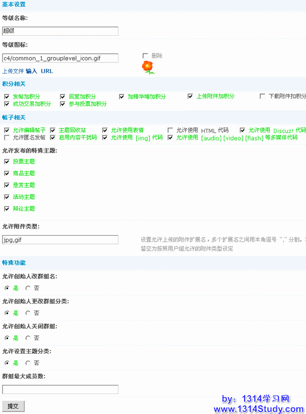 包括等级名称、等级图标、积分相关的设置、帖子相关的权限、允许发布的特殊主题、允许的附件类型以及特殊功能等的设置。