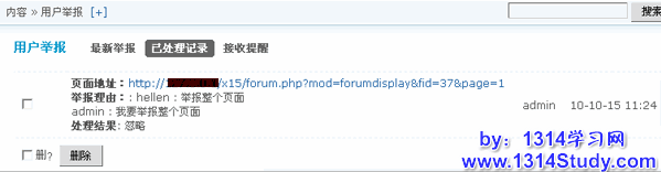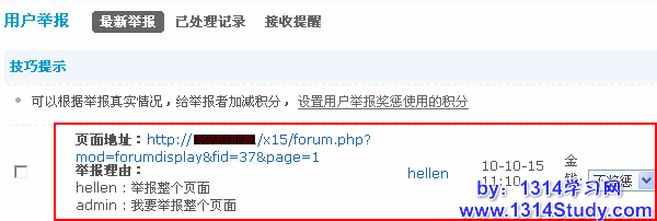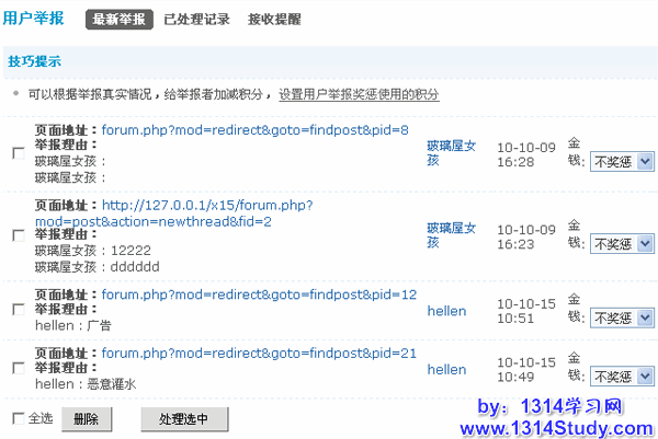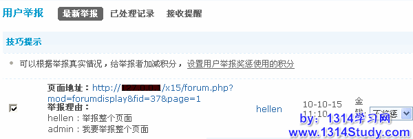 这里列出了用户站点中最新的举报,包括页面地址、举报理由、举报人、举报时间等,可以根据举报真实情况,给举报者加减积分。