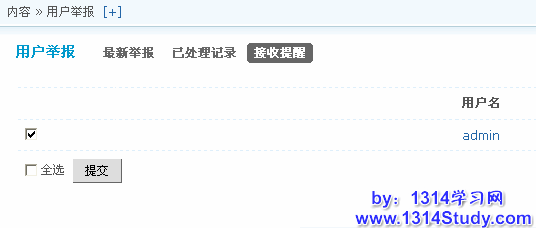 选择接收提醒的管理人员,选中后,当用户举报时接收提醒的管理员访问站点的时候会有新的提醒。