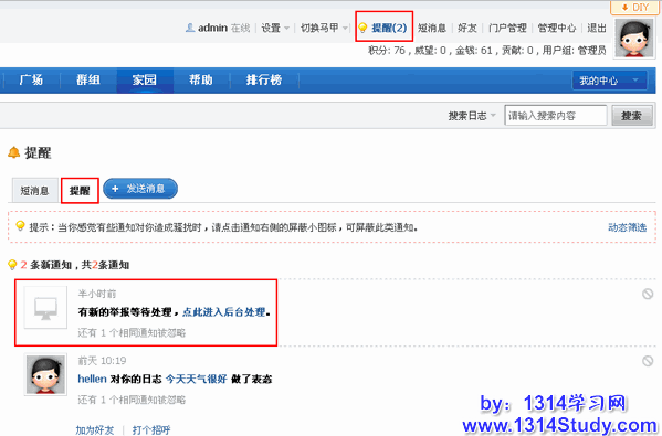 当有会员举报信息,admin 这个管理员访问站点的时候,页头会有新提醒。