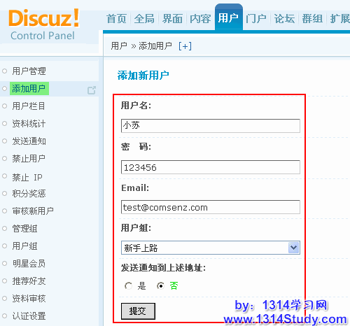 用户组:为新添加的用户设置一个初始用户组,可以是新手会员用户组,也可以是管理组(示例中为:新手上路组);