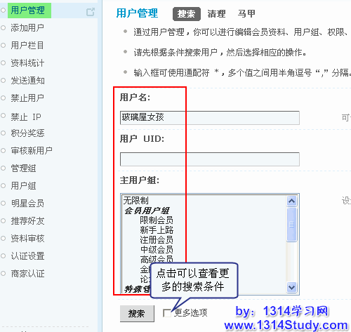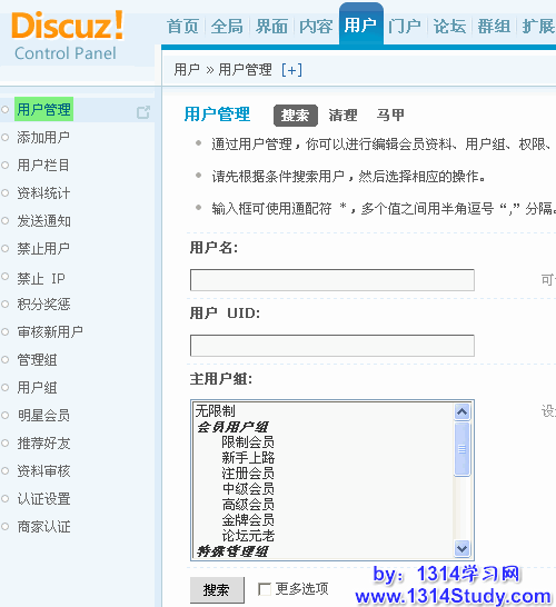 1、管理用户(编辑会员的资料、用户组、权限、积分,授予会员勋章,查找马甲、禁止用户以及删除会员等);