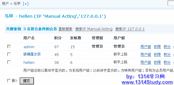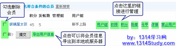 勾选左侧的复选框,然后点击”提交“按钮可删除选中的用户。右边管理功能如下: