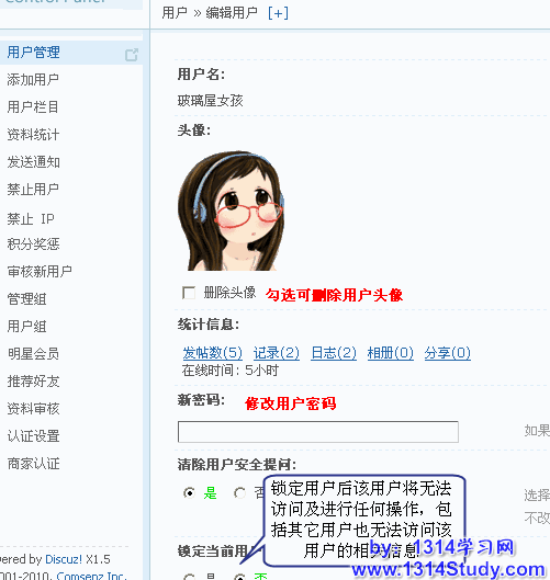 点击“详情”,可以修改用户的资料。其中站长比较常用的是修改用户密码和删除违规头像。如图: