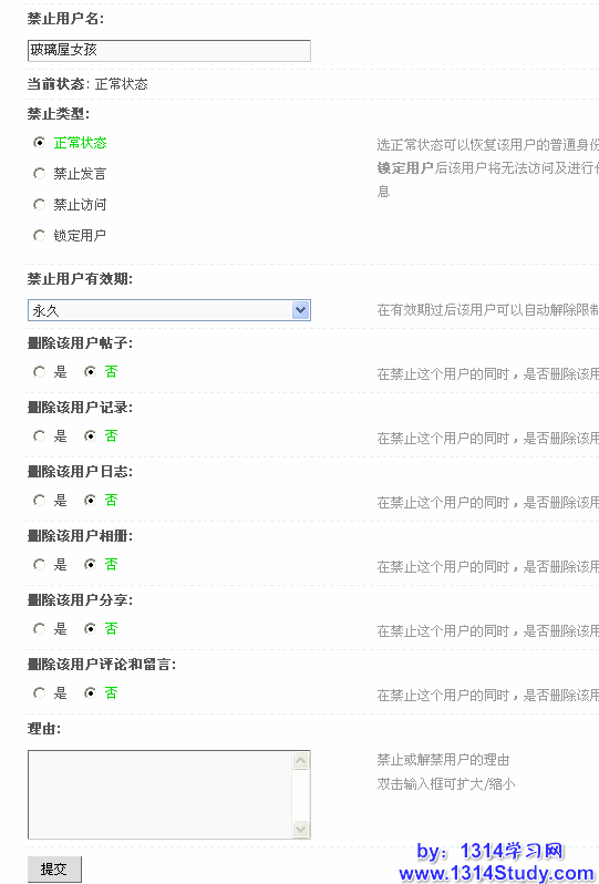 点击“禁止用户”链接,可以直接禁止该用户,包括禁止发言、禁止访问、锁定用户,如下图所示: