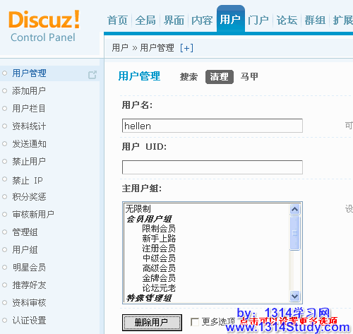 站长可以设置查找条件,批量删除符合条件的用户。还可以选择是否在删除用户帐号的同时,删除用户发帖和 UCenter 中的用户资料。