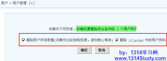 勾选“删除 UCenter 中的用户资料”:在删除该用户的同时,也删除 UCenter 中的资料。