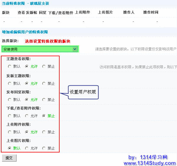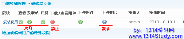 用户在版块中的权限是基于用户和站点间的权限设定,如果设置为非默认状态,将不受用户组的设定限制。