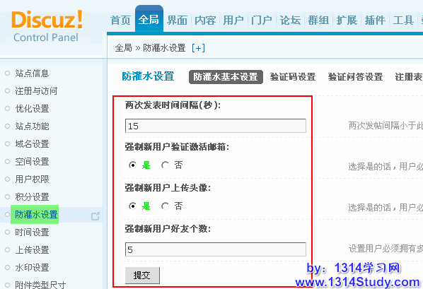 Discuz!X1版本中就已经提供的防灌水设置,从两次发表时间间隔设置来限制广告灌水特征用户的快速“屠版”,此项设置是适合给整站所有级别用户的设置,如果时间设置合理对正常用户的影响较小。
