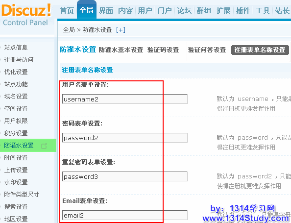 最后,在注册表单名称设置方面,通过个性化注册表单名称的设置,也让灌水程序不能肆意妄为。