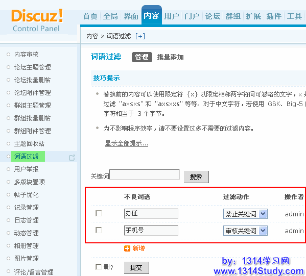 一般广告灌水具备特征关键词,当我们设置好关键词后,一旦有人发表违规内容,系统可以自动的启动监管措施。同时,为了防止广告灌水者用各种手段修改关键词以防止被自动监管,在Discuz! X版本中对关键词替换前的内容可以使用限定符 {x} 以限定相邻两字符间可忽略的文字,x 是忽略字符的个数。如 "a{1}s{2}s"(不含引号) 可以过滤"ass" 也可过滤 "axsxs" 和 "axsxxs" 等等。不良词语如果以"/"(不含引号)开头和结尾则表示格式为正则表达式,以适应更加复杂的字符组合。