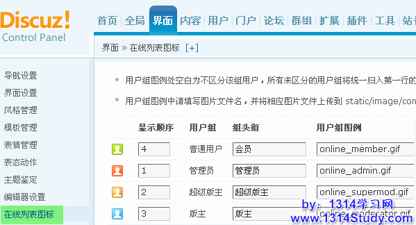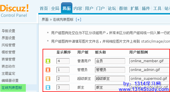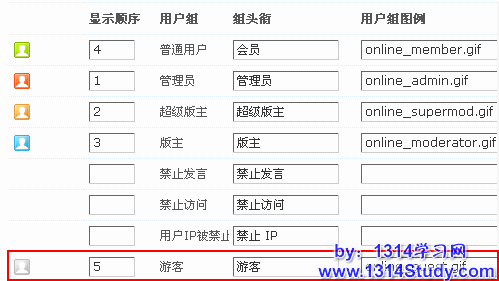 然后,【后台】=>【界面】=>【在线列表图标】,为某个用户组添加“用户组图例”或修改某个用户组的“用户组图例”为刚才上传的图片文件名,以游客为例,为其添加用户组图例“online_guest.gif”,如下图所示: