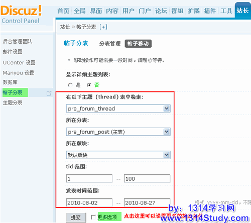 “在以下主题 (thread) 表中检索”会列出主题表存在的所有分表,指定其中一个主题分表,在其中进行搜索。“所在分表”会列出帖子表存在的所有分表,指定其中一个主题分表,在其中进行搜索。点击“更多选项”会出现更多搜索条件。