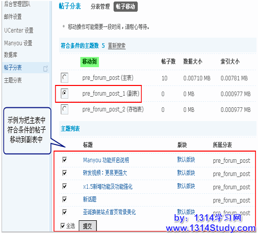 主表、副表、存档表中的数据可以互相移动,有点类似于帖子在版块中的移动。使用“帖子移动”功能可以在各个分表之间移动帖子。帖子移动涉及大量的数据转移,所以需要关闭论坛后使用。为防止数据库在移动过程中出现问题,请先进行数据备份。