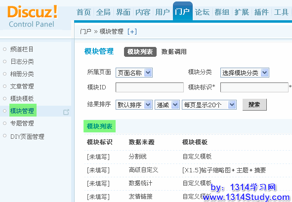 操作路径:【后台】=>【门户】=>【模块管理】中列出了所有的模块列表,包括模块标识、数据来源、模块模板、更新时间、所在页面以及相关的操作。