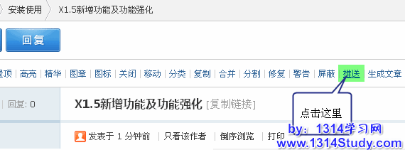 当站长想把某个精华帖或者回复数较多,大家比较关注的帖子单独拿出来放在首页比较醒目的位置的时候,可以进入该帖子,点击帖子上方【推送】链接,如下图所示