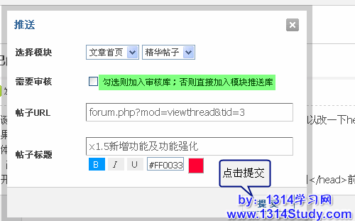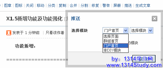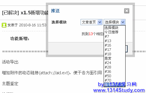 你想在站点的首页显示精华帖子吗?您想把推荐的热帖显示在醒目的位置吗?您想让自己的站点更吸引眼球吗?帖子模块推送可以帮你实现你想要的,所谓帖子模块推送就是把某个帖子推送到某个指定的模块下进行显示,如把某个比较热门的帖子放在今日推荐的模块里并在门户首页显示,同时也可以让帖子生成文章,即将某个比较重要或者回复率较高的帖子生成门户文章放在指定的频道下进行独立显示。