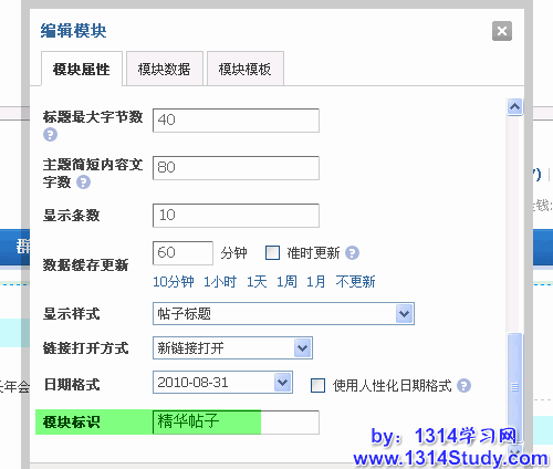 进入选择模块的页面,页面选择门户首页,会列出相应的模块数,模块选择把要帖子显示到哪个模块里,可以对应前台模块的显示位置,DIY 查看模块的标识来进行选择,如下图为精华帖模块。