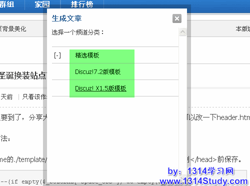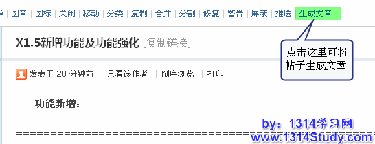 当站长想把某篇比较热门的帖子生成文章,在频道下独立显示,可以在该帖子的上方点击【生成文章】链接,如下图所示: