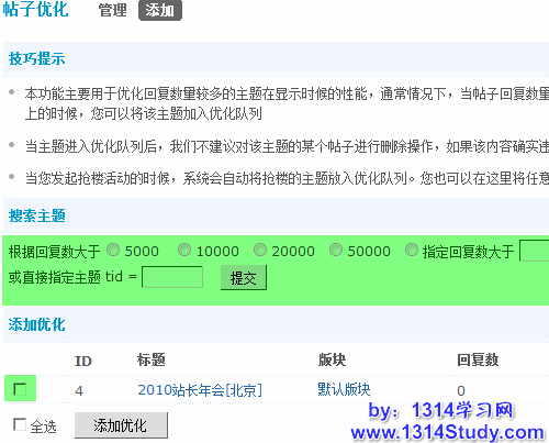 图中的列表表示已经加入优化的帖子列表,在此列表中可以了解到每个加入优化的帖子的ID、标题、所属版块、总回复数、发表日期。