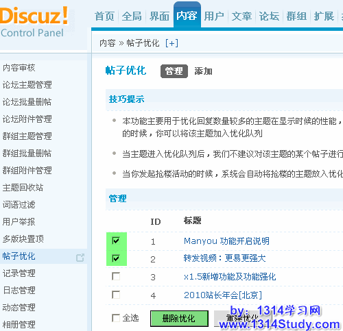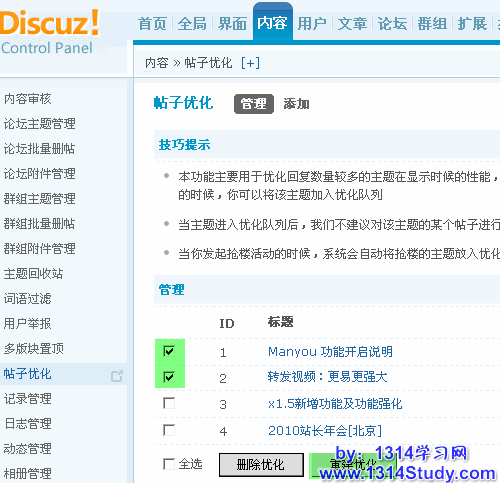 操作路径:【后台】=>【内容】=>【帖子优化】