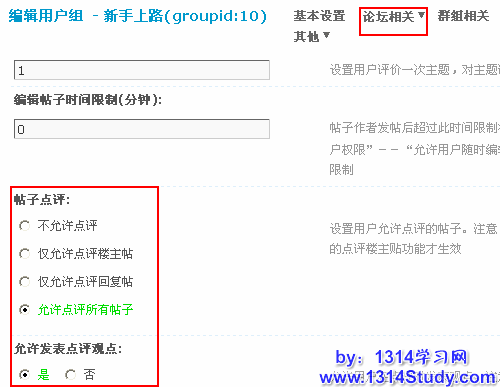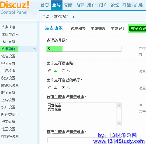 在此处可以设置帖子内点评的显示条目数、是否允许点评楼主帖、是否允许点评自己的帖子,以及对点评时的预置观点的设置等。