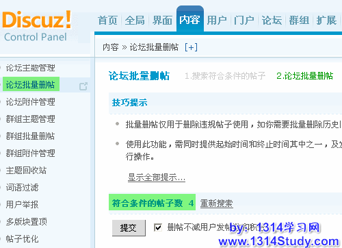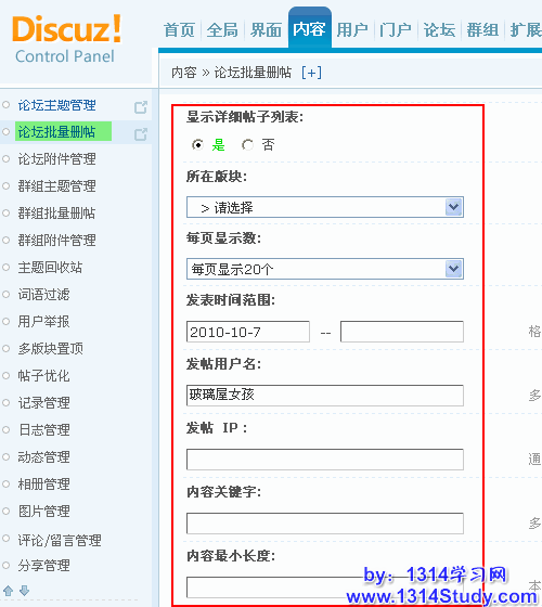 操作路径:【后台】=>【内容】=>【论坛批量删帖】