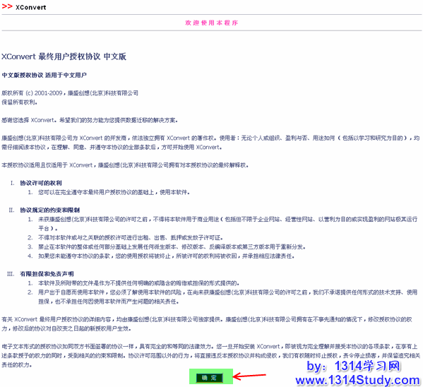 1、将 XConvert 文件夹上传到 web 可以访问的目录下,在浏览器里输入 http://yourwebsite.com/xconvert 就看到了授权协议,点击“确定”,如下图所示: