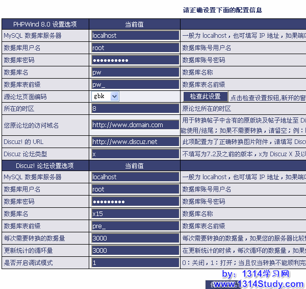 1)phpwind 数据库字符集:有 GBK、UTF8、BIG5 三种,如果不知道网站的数据库字符集,选择其中的一种,点击右方的“检查此设置”,程序会提取的 pw 的部分数据转换做个测试,如果显示正常说明数据库字符集正确,否则重新设置并检测。