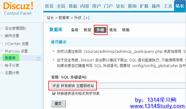 如果版块太多,一个一个版块开启太麻烦,还可以到【后台】=>【站长】=>【数据库】=>【升级】=> “常用 SQL 升级语句”里面选取“开启所有版块主题回收站”。