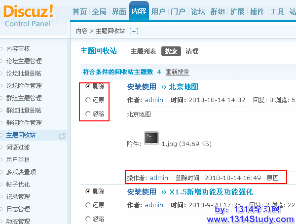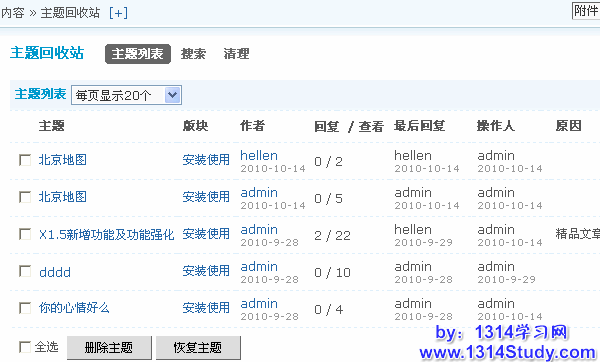 很多站长为版主或者超级版主等管理人员删除帖子而困扰,因为可能版主一时疏忽或者跟帖子作者闹矛盾,而滥用自己的权利,将帖子删除了。作为站长,这是最不想看到的情况,那么怎样避免和防止这种情况的发生呢?很显然,版主在其管理的版块里删除帖子是很合情合理的事情,如果删除了帖子,管理员还能将删除的帖子恢复,那样就最好不过了。Discuz! X1.5 的主题回收站便能实现这个愿望,将前台删除的主题先放到主题回收站里,以便管理员进一步确认是否删除。