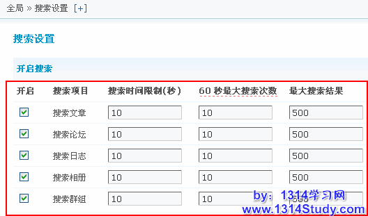 首先让我们开启搜索功能,可以在后台进行设置开启、限制搜索。