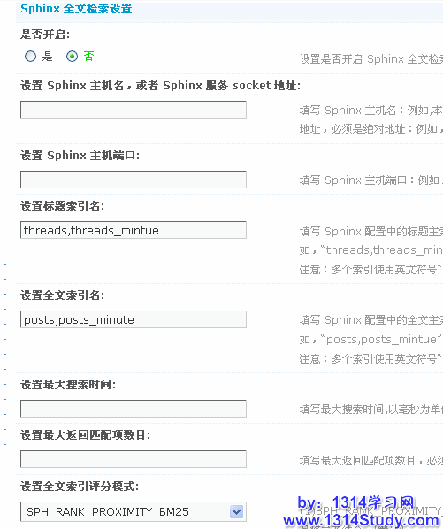 开启Sphinx 全文检索后,需要填写 Sphinx 主机名:例如,本地主机填写“localhost”,或者填写 Sphinx 服务 socket 地址,必须是绝对地址:例如,/tmp/sphinx.sock。
