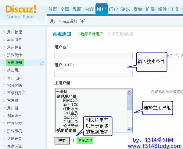 选择给哪些会员发送通知时,可以采用搜索的方法,筛选符合条件的会员,Discuz! X1.5 内置的搜索条件包括用户名、用户 UID、主用户组、Email、积分范围、发帖数范围、IP、注册时间、访问时间、发帖时间及用户信息等。这里的用户信息与用户栏目设置有关,被启用的资料项都会在这里显示。