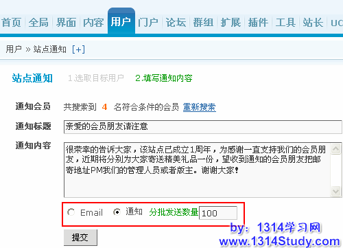搜索到符合接收通知条件的会员后,发送方式选择 Email 或站内通知,并设置分批发送数量,填写通知标题及通知内容后提交即可。