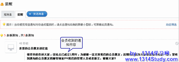 管理员成功发送通知后,会员登录站点的时候会收到新的提醒,点击后会看到通知内容,如果管理员选择以Email方式发送通知,那么会员将会收到邮件。