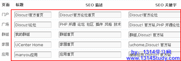 这里包括了门户、广场、群组、家园以及应用各频道的标题、SEO 描述以及SEO 关键字。