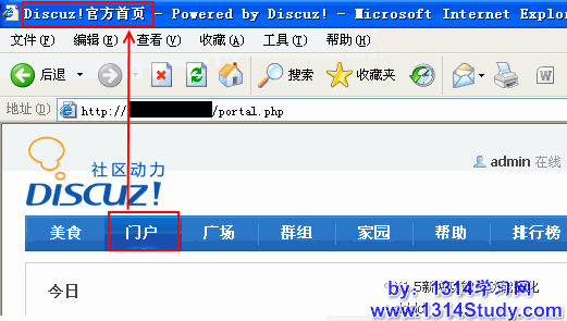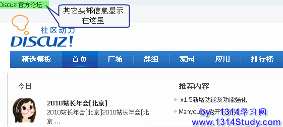 点击导航栏上相应的频道即可在浏览器标题处显示在后台填写的标题内容,比如首页填的是“Discuz!官方首页”那么在站点导航栏上点击首页就会出现上图所示的内容,其它如广场、群组、家园、应用同理。