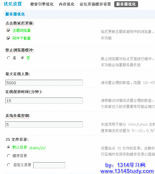 服务器优化可以对论坛的一些参数进行调整,从而均衡服务器的负载。进入【后台】=>【全局】=>【优化设置】=>【服务器优化】,可以看到服务器优化的各项设置。
