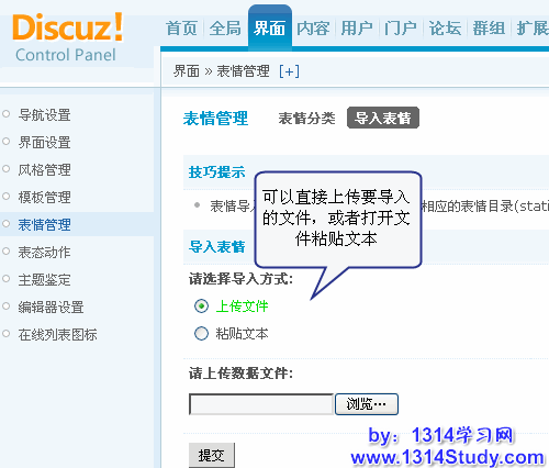 如果想导入从另一 Discuz! 论坛后台导出的表情,请点击上方的“导入表情”如下图所示: