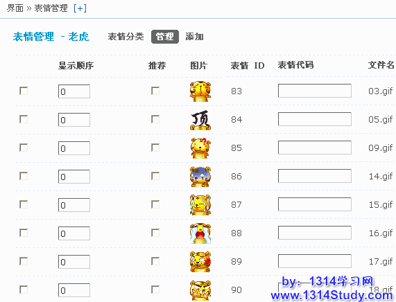 【后台】=>【界面】=>【表情管理】,即可看到下图所示: