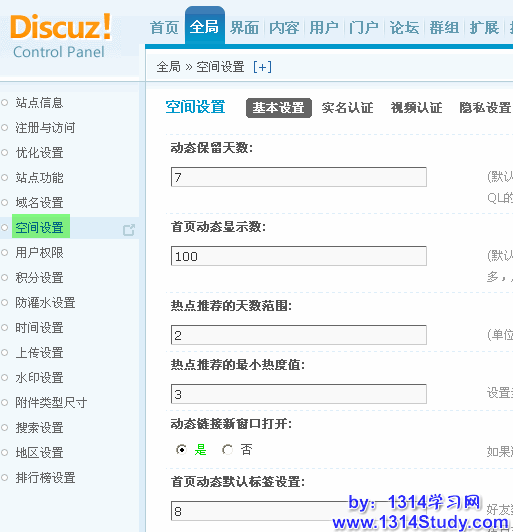 空间设置中主要包括了之前 UCHome 中的部分设置项目,主要有动态保留天数、首页动态显示数等一系列相关的设置,同时还包括了实名认证设置、视频认证设置,以及隐私设置,其中开启实认证和视频认证可以有效的防止灌水,下面我们一一讲解。