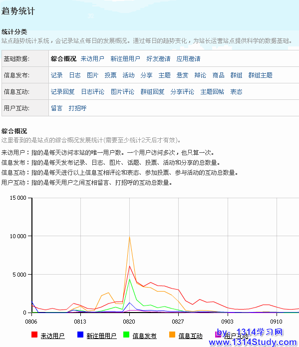 站点趋势统计系统,会记录站点每日的发展概况,统计功能细分到从来访用户到注册用户在社区里的每个动作。通过每日的趋势变化图,为站长运营站点提供科学的数据基础。
