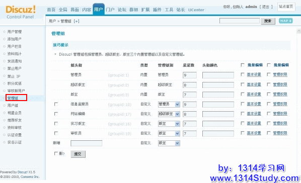 站长登陆Discuz! X 1.5后台,在“用户”栏目的“管理组”下,可以对前台管理团队进行设置。管理组包括管理员、超级版主、版主三个内置管理组以及自定义管理组。