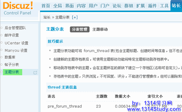 第一次访问主题分表功能,会看到默认拥有一个主表,名称为pre_forum_thread,此表为安装 Discuz! X1.5后的标准主题表。此主表信息不可删除,不可更改。