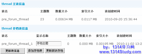 首先,根据主题表大小,建立存档表,存档表以 pre_forum_thread_数字 自动命名,如下图所示,建立了一个存档表: