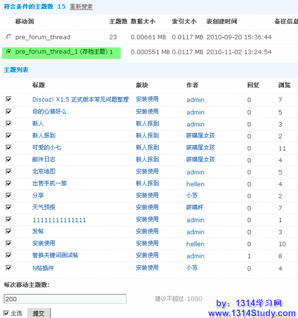 主题移动功能可将特定的主题在原始表(forum_thread)和新建的主题存档表之间移动。移动主题之前,请确定存在至少一个主题存档表(表名为 forum_thread_1、forum_thread_2……)。
