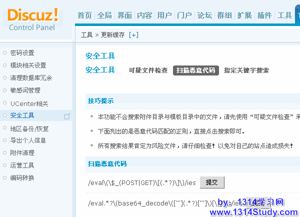 1、本功能不会搜索附件目录与模板目录中的文件,请先使用“可疑文件检查”来检索这些目录中是否有PHP文件。